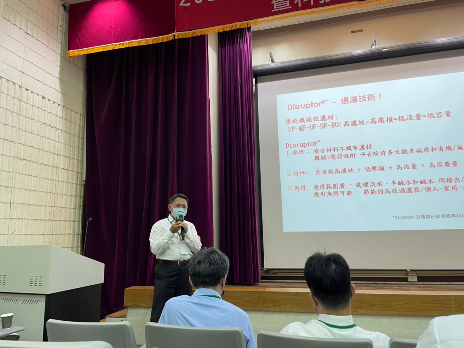 新加坡商奧斯龍明士克亞洲控股有限公司台灣辦事處 梁明智 處長 介紹「家用淨水技術與產品近況及Disruptor的特性」,水過濾的大環境議題涵蓋ESG相關水資源與能源問題,以及缺乏安全乾淨飲用水。Disruptor過濾技術是一種複合材料不織布濾材,結合機械過濾及電荷吸附之過濾原理去除許多次微米病原和有機/無機汙染物,具有奈米級高效率、低壓損、高流量及高容塵量等特性,可應用於個人、家用、商用及產業用領域之飲用水或廢水過濾及淨化。