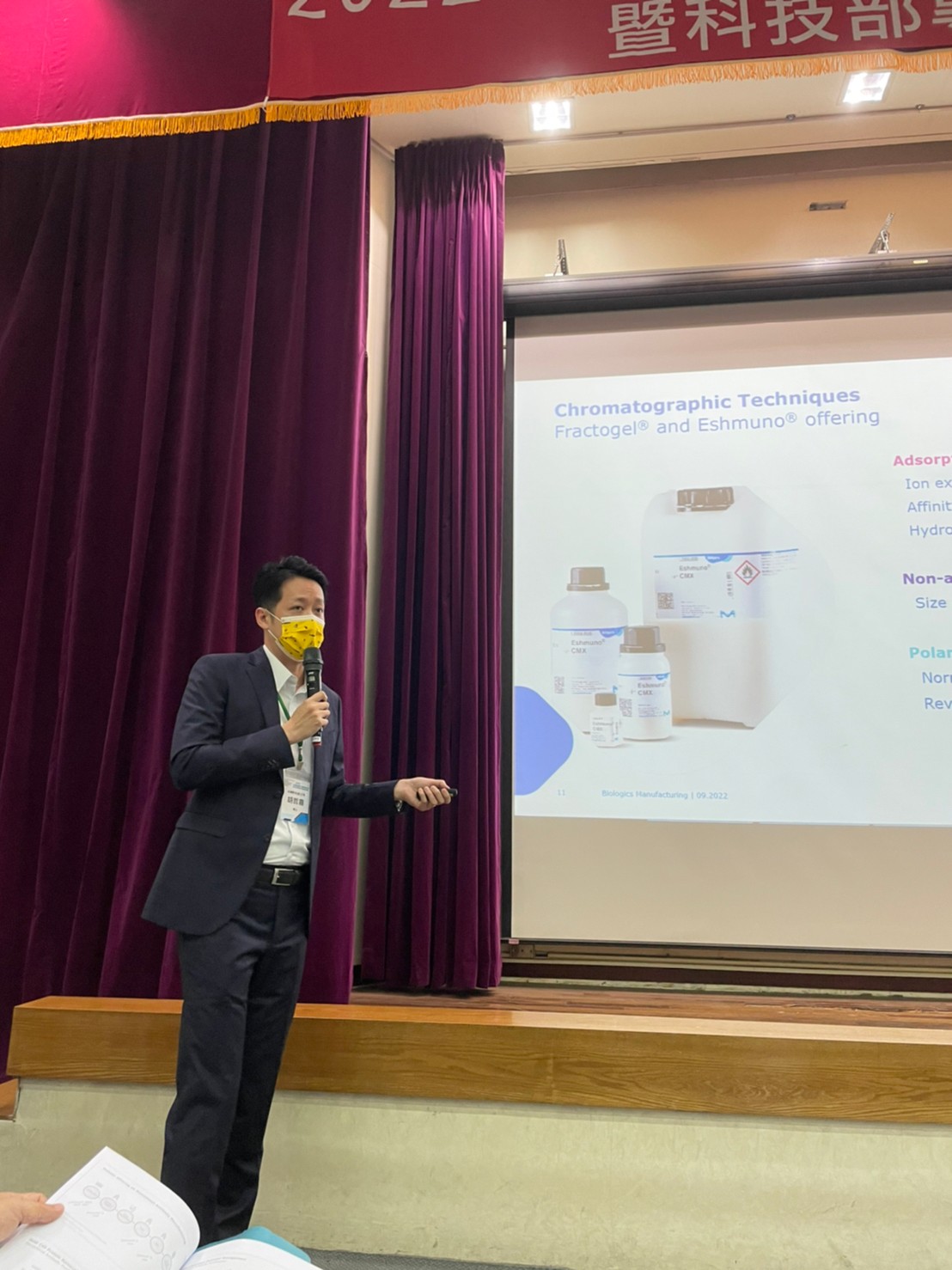 台灣默克股份有限公司 生命科學事業體製程應用處 亞太區下游純化產品經理 胡哲嘉 博士 分享「生物製劑生產與技術發展趨勢」,介紹生產單株抗體生物製劑所面對的挑戰與發展趨勢,在濾膜選擇上須考量材質、孔徑/截流分子量、清潔條件、化學穩定性等。默克公司提供完整的單株抗體生產解決方案,包含澄清過濾、蛋白A親和層析、重組蛋白捕捉、分離血液分子及病毒過濾等。未來技術發展驅動力為單元操作串接及分析、軟體及自動化與一次性操作等。