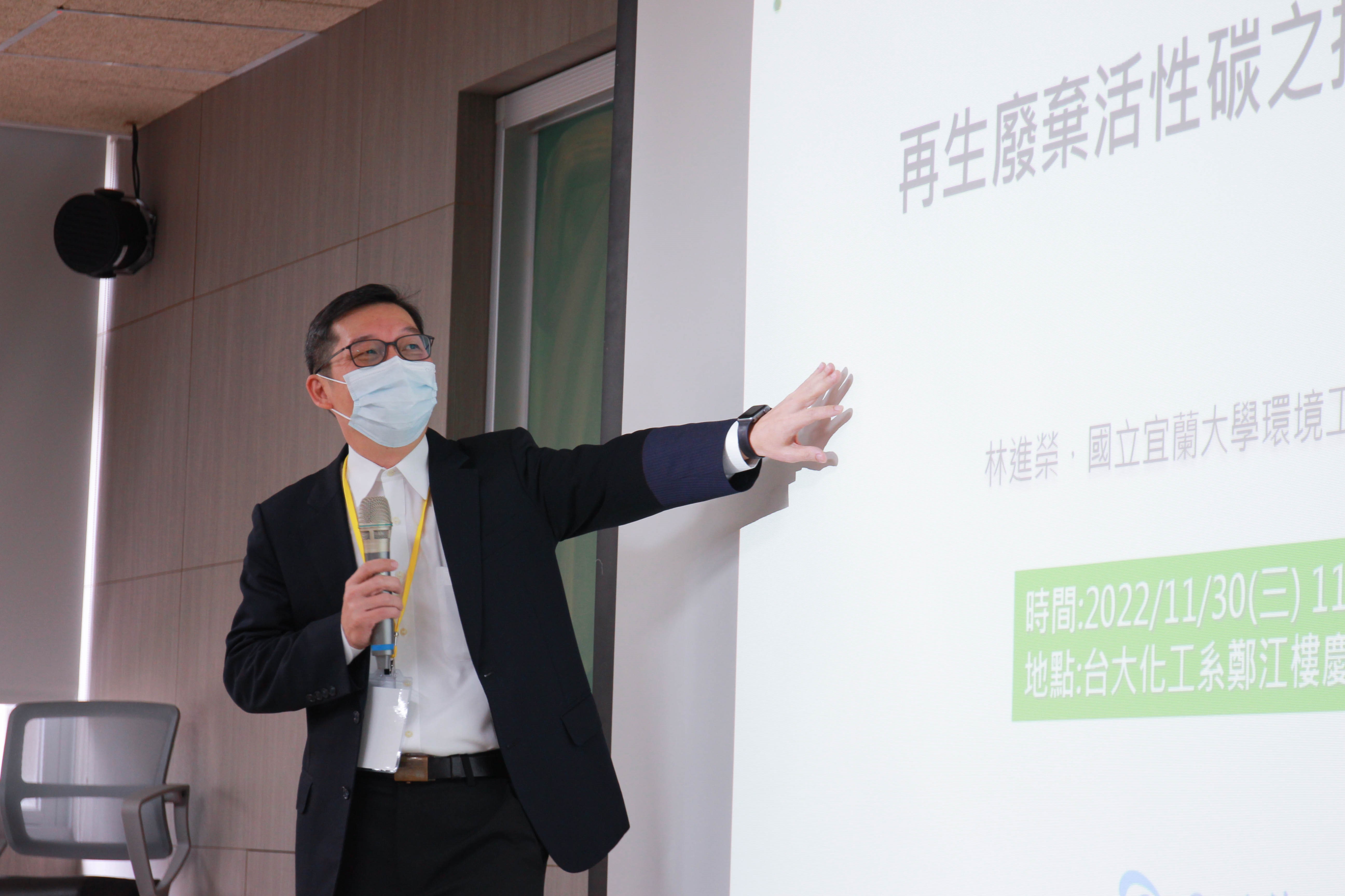 國立宜蘭大學環工系 林進榮 教授演講「再生廢棄活性碳之技術與挑戰」。臺灣每年進口數量龐大的活性碳用於整治污染,但使用後的廢棄及資源耗用問題,凸顯再生使用的重要性,相較於傳統熱再生法,使用水熱再生法可在相對低溫的水條件下進行反應,水可作為反應物、做為觸媒、壓力的生成與傳播、促進原子與分子再排列及促進物質的溶解,讓吸附之上的污染物被脫附、轉化和破壞。水熱再生活性碳經過多次循環吸附/再生可獲得活性碳回復率90%以上,兼具汙染整治、循環經濟和成本競爭力。
