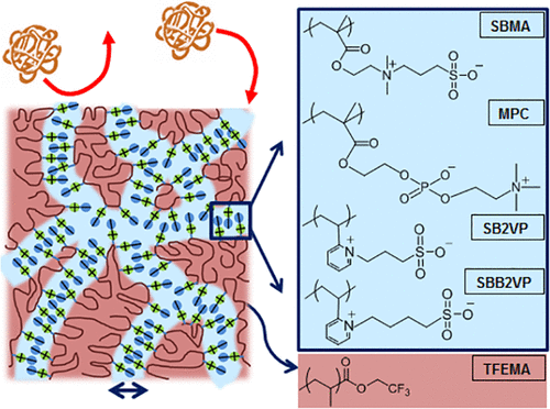 美國塔夫茨大學(Tufts University)的Asatekin教授團隊利用兩性離子兩親共聚物 (ZAC) (其為疏水性和兩性離子單體結構單元的非晶共聚物)來開發自組裝水過濾膜。兩性離子是親水性分子,含有相同數量的共價結合的正電荷和負電荷。由於兩性離子的獨特性質,ZAC 可以自組裝形成約 1.5 nm 兩性離子奈米孔網絡。在多孔支撐物上方塗佈一層薄的 (~ 1 µm) ZAC 層製成複合膜,在水過濾過程中,兩性離子區充當親水性奈米通道網絡,用於傳輸水和小溶質。由於兩性離子的強烈水合作用,這些膜表現出前所未有的抗汙染性,在過濾含有高濃度油和生物大分子的廢水流時完全保持其滲透性。在 24 小時的蛋白質汙染實驗中通量維持不會下降。由與 2-甲基丙烯醯氧乙基磷酸膽鹼的共聚物製備的膜親水性最強,透水率最高,高於類似孔徑的商業膜。