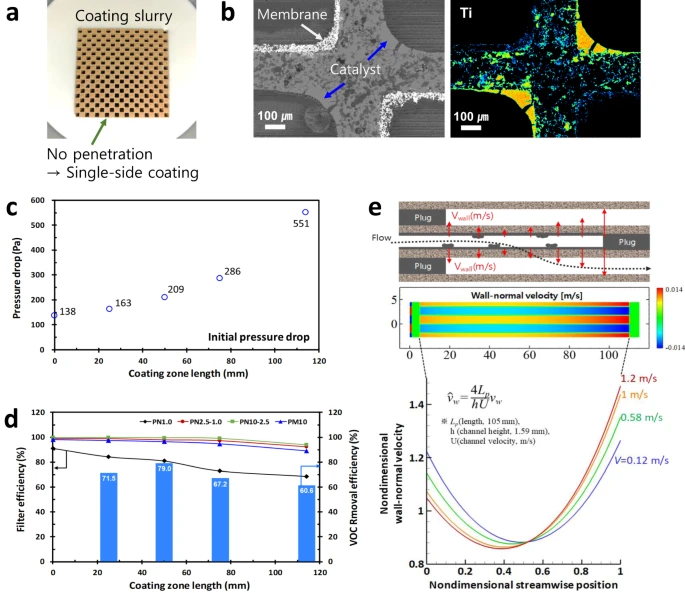 此研究採用具有 100、200 和 300 CPSI 的商用陶瓷過濾器,其中 CPSI 表示過濾器每平方英寸的單元數,將光觸媒催化劑(TiO2與Cu2O-TiO2)塗覆在出口通道表面以防止空氣流動與防止失活。橫截面 SEM 圖像和 Ti 的元素表示內部孔隙(黑色)、催化劑塗層(灰色)和膜(白色)。由沿著催化劑塗層長度的壓降、濾效和去除效率之間的關係得知壓降沿塗層長度呈指數增加,且濾效逐漸降低,若控制在 50 mm以下的塗層區域,其具有低的壓降與最佳去除效率。