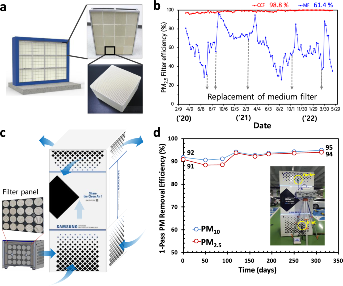 a安裝在建築物的 HVAC 設施中的陶瓷催化劑過濾器面板系統。b在建築物中測量 30 個月的 PM2.5 過濾效率。c獨立式原型陶瓷催化劑過濾器系統。d陶瓷催化劑過濾器系統原型經過大約 12 個月的PM10和PM2.5的過濾效率。
