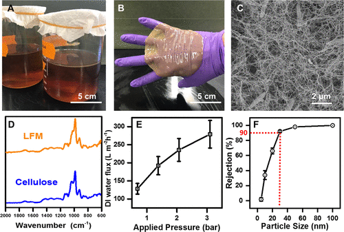 活性過濾膜 (LFM) 特性:(A) 在空氣-水界面生長的 LFM 的照片;(B) LFM 在戴手套的手上的照片;(C) LFM 的掃描式電子顯微鏡 (SEM) 照片,顯示纖維素纖維結構。
