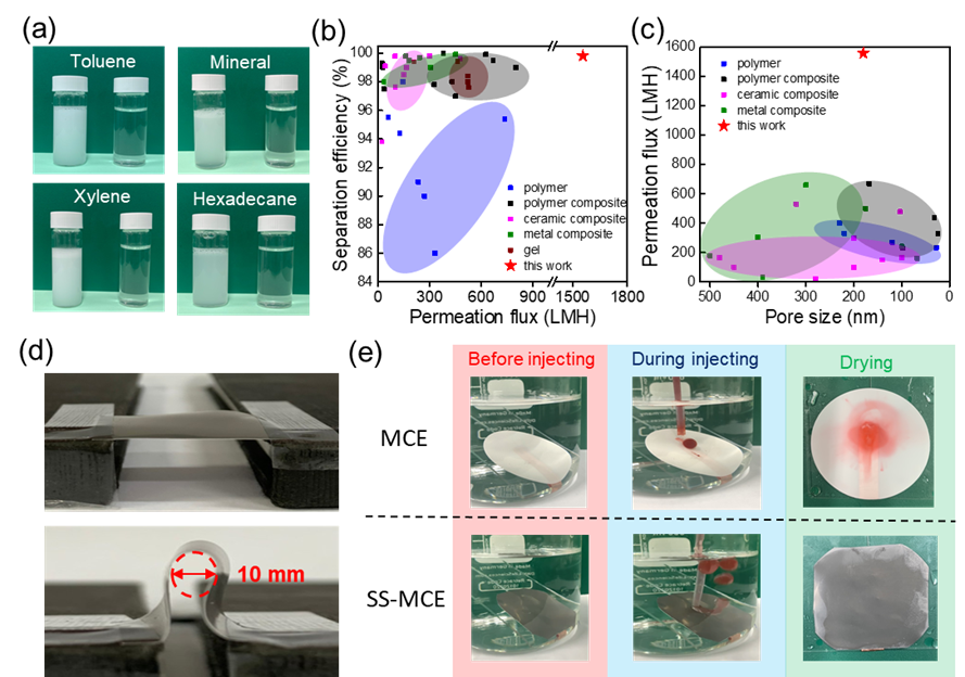 乳化液分離之應用 (a)分離應用之光學影像 (b)分離效率及通量之文獻比較 (c) 薄膜孔徑及通量之文獻比較 (d)彎曲測試 (e)抗汙測試。