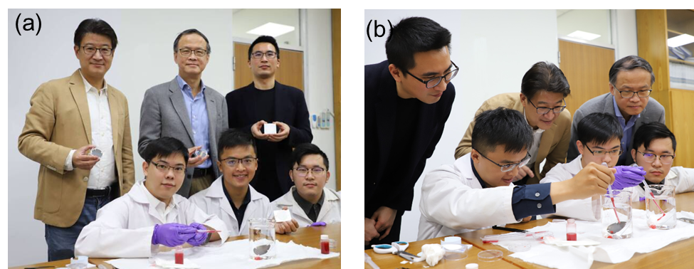 半導體油水分離有高效解方,台大等跨校團隊合影(a,b)。(a)圖為團隊成員如台大化工系教授童國倫(後排左一)、台科大材料系講座教授朱瑾(後排中)、台科大化工系教授江偉宏(後排右一)和學生們。(台科大提供)。