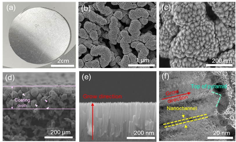 混合纖維素酯奈米結構的不銹鋼鍍層膜結構分析。表面結構分析 (a)光學影像 (b)低倍率掃描式電子顯微鏡影像 (c)高倍率掃描式電子顯微鏡影像。縱向結構分析 (d)電子顯微鏡影像 (e)穿透式電子顯微鏡影像 (f)高倍率穿透式電子顯微鏡影像。