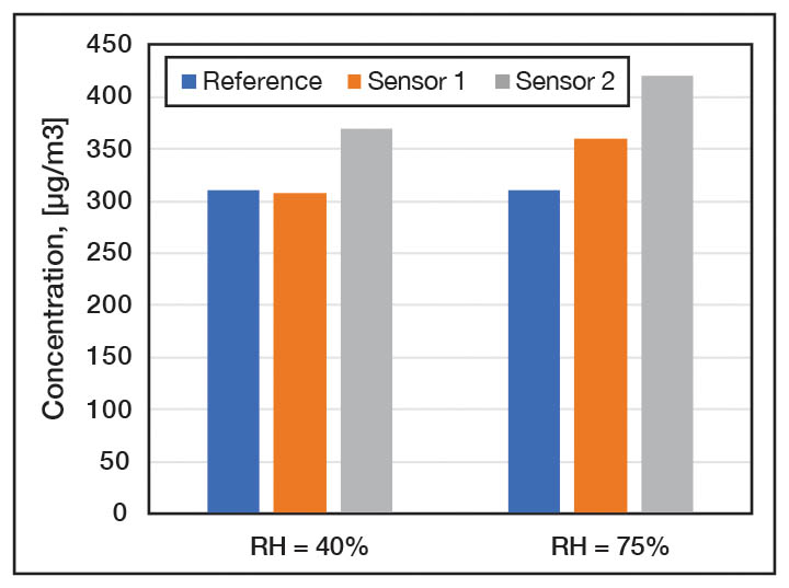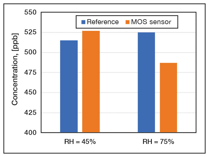 揮發性有機化合物感測器常採用電化學和半導體方法的氣體傳感機制。金屬氧化物半導體 (MOS) 感測器是電阻式感測器,因為電阻會隨著與目標氣體的相互作用而變化,為了增強感測器的反應性,使用局部加熱器來提高傳感材料的溫度,透過測量 MOS 氣體感測器的電阻來檢測氣體濃度。最常用的 (MOS) 氣體感測器採用 ZnO 和 SnO2,其氣體響應良好、尺寸小且成本低。溫度和濕度對感測器精度以及交叉靈敏度的影響是主要缺點,環境空氣中硫化氫、氨和酒精的存在也會嚴重影響 MOS 感測器的精度,下圖說明相對濕度對 VOC 測量的不良影響。