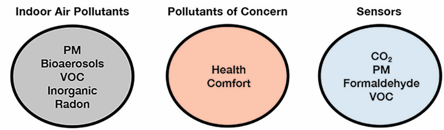在室內環境中,可以發現數百種化合物 (揮發性有機化合物和無機物)、生物氣溶膠和顆粒物,應鑑別已知對人類健康有不利影響的汙染物,並選擇合適的感測器。世界衛生組織 (WHO) 已確定以下汙染物為最受關注的汙染物:苯、一氧化碳、甲醛、萘、二氧化氮、PM2.5、多環芳烴 (PAH)、氡氣和三氯乙烯。根據對美國住宅室內汙染物濃度的測量和相關健康危害的評估,以下九種汙染物:乙醛、丙烯醛、苯、1,3-丁二烯、1,4-二氯苯、甲醛、萘、二氧化氮和 PM2.5 危害較大。其中最受關注的前五名汙染物包括:PM2.5、SHS (二手煙)、氡氣、甲醛和丙烯醛。