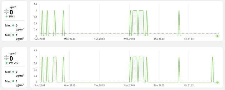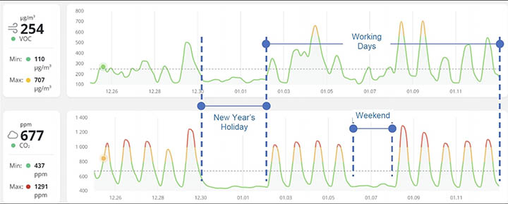 在智慧城市的發展上,良好的空氣品質解決方案可以為建築環境和人類居住者的福祉帶來附加價值。最近的一項研究案例強調在人口稠密的電話服務中心進行連續空氣品質監測的好處。工作人員到達工作地點時造成空氣品質的惡化,然後在離開時又恢復到可接受的環境。儘管員工互動和呼吸模式顯著影響室內空氣品質,但收集的數據幫助管理部門決策是否維護或升級空氣過濾器,例如:增加通風量,並安裝化學過濾器,以處理辦公時間內存在的揮發性有機化合物 (VOC) 濃度。如圖 11 所示,過濾器升級後,PM1 和 PM2.5 濃度有所降低。圖12為電話服務中心工作日與週末的 VOCs 和 CO2 空氣品質監測比較。