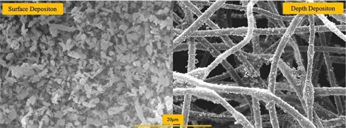 空氣過濾器結構中不可或缺的元素是其濾材,其特性控制過濾程序、過濾器的性能,以及顆粒是否會透過樹枝狀累積或濾餅形成沉積在過濾器的深層或表面,或完全通過過濾器。然而,濾材的不均勻性對過濾器性能預測產生極大挑戰,如圖 2 所示。濾材應具有透氣性、高效性,並具有維持氣流所需的結構完整性,而不會發生改變性能的變形。