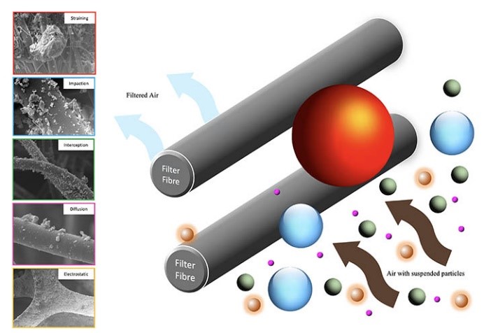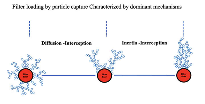 因此,空氣過濾的作用不是只依靠一個過濾階段來完成,主要機制受到顆粒尺寸及其分佈的影響,如圖 4 所示,且影響顆粒捕獲的過濾器負載特徵,如圖 5 所示,取決於許多相互關聯的因素,例如氣溶膠尺寸、面速度、密度和濾材中的纖維堆積。此外,相鄰纖維、樹枝狀累積形成和纖維電荷會影響真實過濾器的負載。
