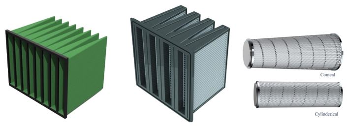 燃氣渦輪機中使用的靜態[左、中]和脈衝過濾器[右]的範例。