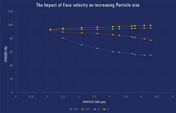 所有粒徑的面速度和效率之間的關係並不一致,由於慣性撞擊和顆粒尺寸之間的相互作用,較小的顆粒難以在較高的面速度下有效地與過濾介質相互作用。因此,隨著表面速度的增加,這些顆粒的過濾效率往往會下降,如下圖所示,這在重視捕集小顆粒的情況,如在潔淨室或空氣品質需要嚴格管控的環境中是相當大的挑戰。相反地,對於較大的粒子,動力學發生巨大變化,增加面速度賦予強大的慣性力,有效增加顆粒與過濾材碰撞的機會,使得較大顆粒在較高面速度下的過濾效率有所提高。