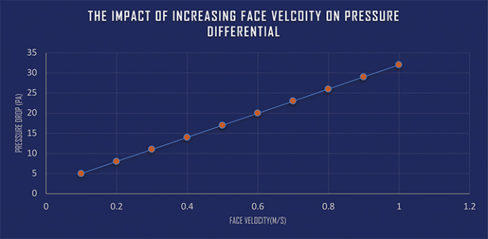 過濾器面速度主要影響壓力差,通常稱為壓力降。在過濾系統中,壓力差是性能的主要指標,並且與過濾速度密切相關。面速度越高,壓力降越大,如下圖所示。隨著氣流速度的增加,空氣通過過濾器的運動阻力也隨之增加。