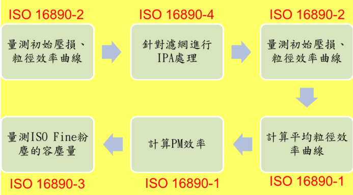 ISO 16890為2016年底公佈的過濾器測試和評估標準,採用尺寸範圍為0.3-10 μm的顆粒作為測試介質,以涵蓋現實過濾情境中常見的各種顆粒,為了解面速度在影響整個粒徑範圍內過濾效率的重要性。ISO 16890測試標準共包括四個子標準,其內容分別如下: