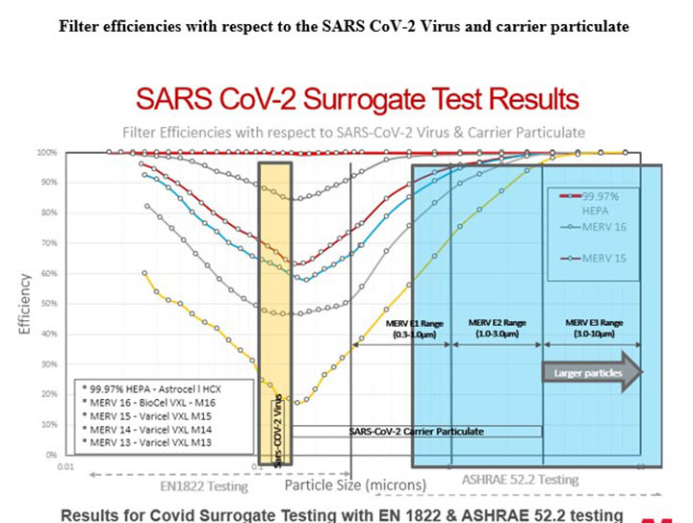 除了使用修改的 ASHRAE 52.2 測試方法之外,AAF 還使用 EN 1822 測試方法測試過濾器對小於 0.3 μm 顆粒的效果,所有類型過濾器的過濾效率在 0.1-0.2 μm左右 (MPPS) 時最低,並且隨著顆粒變小而再次增加。從下圖中可以看出,高 MERV 等級的過濾器能減少空氣傳播的病毒。儘管病毒遠小於 0.3 μm,凡能去除 1 μm 以下顆粒的過濾器也能有效去除病毒。使用 HEPA 過濾器是最佳方法,但在無法使用 HEPA 過濾器的情況下,升級到最高的 MERV 過濾器能提供最佳保護。