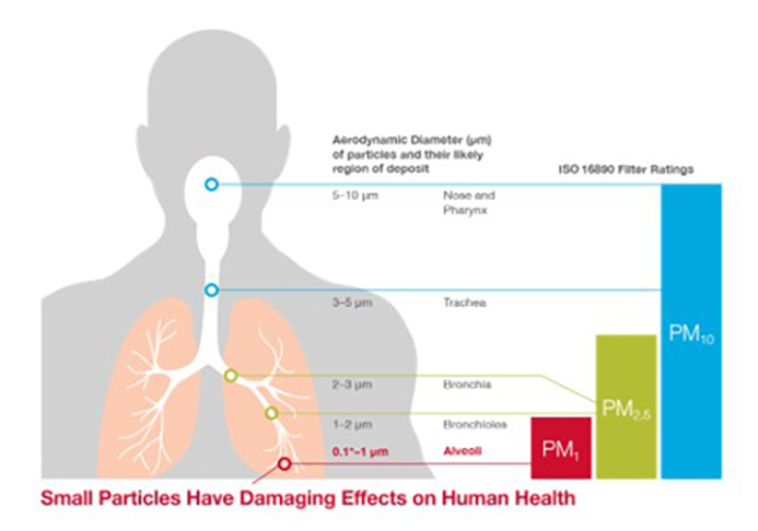 微粒尺寸與人體健康息息相關,直徑 10 μm 或更小 (≤ PM10) 的顆粒物可以穿透並滯留在肺部。直徑 2.5 μm或更小的顆粒物 (PM2.5) 可深入肺部,小於 0.5 μm的顆粒物可穿過血氣屏障進入血液,長期接觸顆粒物會增加罹患心血管和呼吸系統疾病,以及肺癌的風險。