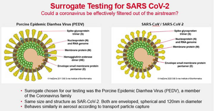2018 年,在新冠病毒流行前,AAF Flanders 與明尼蘇達大學合作,在 AAF Clean AIR Center 的生物實驗室中執行,這是空氣過濾產業首次對豬特有的病毒進行測試。該測試採用修改的 ASHRAE 52.2 標準方法進行,其中使用標準化的 ASHRAE 測試風道,並用標有螢光染料和目標病毒疫苗形式的氯化鉀 (KCl) 顆粒霧化溶液對不同效率的過濾器進行測試,流量範圍為 650-1968 cfm,並且使用大量氣溶膠產生器來產生氣溶膠。過濾器上游和下游的空氣樣本使用尺寸範圍為 0.3-10 μm 的安德森級聯衝擊器收集。病毒顆粒、KCl 和螢光示蹤染料被物理捕集在衝擊板上,隨後去除並純化病毒,使用逆轉錄聚合酶鏈反應 (RT-PCR) 和螢光計進行定量,以估計顆粒的質量。對於每種顆粒尺寸,計算去除效率。