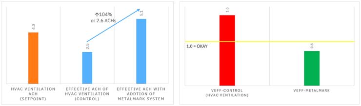 事實證明,氣流模式在實現預期的空氣淨化目標方面相當重要。考慮到測試空間的通風效能評級(VEFF),Metalmark系統將該空間的有效換氣次數(ACH)從2.48(控制條件)提高到5.06(Metalmark),增強了HVAC設置的4次換氣效果。簡單來說,它可以在最高空氣淨化水準下為房間空間增加2.6次有效換氣次數,作為現有通風水平的補充或部分替代。這在達成ASHRAE標準241所要求的足夠空氣中病原體去除水準時特別具有相關性,尤其是在考慮到室外空氣品質差以及能源和氣候足跡減少需求的情況下。
