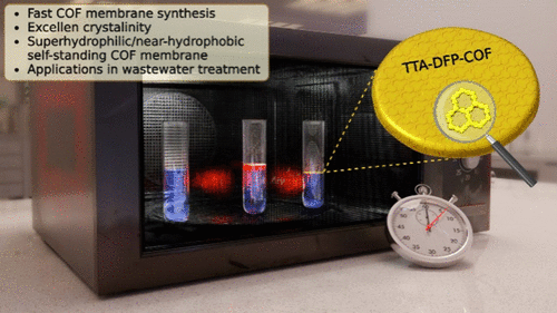 在水處理領域中,金屬有機框架(MOF)和共價有機框架(COF)等網狀材料為自下而上(bottom-up)的膜合成方法提供許多的研究亮點。COF是由輕元素(C、N、O、B等)組成的多孔奈米材料家族,具有優異的結構多樣性、可調節和永久的孔隙率、有序結構以及高熱穩定性和化學穩定性,可應用於氣體吸附、水處理、能量儲存、感測、藥物輸送和催化作用等領域。傳統使用界面聚合法來製備自支撐COF膜,但其合成非常耗時,可能需要很多天,而且大多在基材上生長為薄膜,再加上大多數芳香胺結構單元的溶解度較差,使得在液-液界面上應用界面聚合來合成COF膜具有挑戰性。 在這個研究中,研究人員將微波輔助合成與二噁烷-水(dioxane-water)蒸氣界面處的新型自組裝技術結合,成功合成了一系列雙超親水/近疏水自支撐亞胺連接TTA-DFP-COF膜,透過微波照射(300 W),在110°C下共價連接2,6-二甲醯吡啶(DFP)和4,4',4"-(1,3,5-三嗪-2,4,6-三基)三苯胺(TTA),膜在液-氣界面處形成,透過調整微波照射時間的到厚度25、55和85 μm的COF膜。在對照實驗中,使用烘箱和油浴作為加熱源的話,僅產生粉末,而不是膜。膜的二噁烷面(DF)較為粗糙,具有末端醛基,使其幾乎呈疏水性;蒸氣面(VF)相對較光滑,表面的醯胺基團使其呈近親水性。