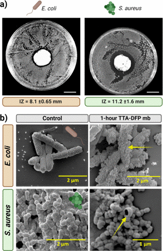 抗菌特性。(a)膜對細菌的抑制區影像。(b)與膜接觸1小時後細菌出現顯著的結構破壞。