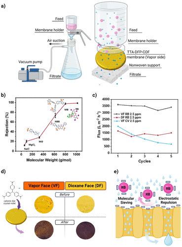 TTA-DFP-COF薄膜的過濾測試。(a)真空過濾系統。(b)去除率。(c)水通量的變化。(d)過濾前後膜的VF和DF表面照片。(e)陰離子染料排斥機制。