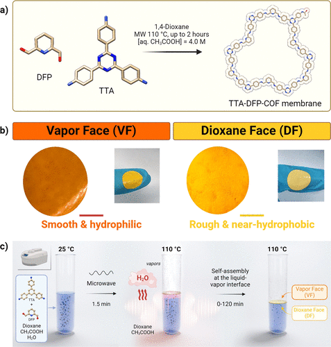 連續、無缺陷、高度結晶、多孔及自支撐的TTA-DFP-COF膜。(a)膜的化學結構和合成途徑。(b)膜的表面光滑且有光澤,反之二噁烷表面粗糙且無光澤。(c)膜形成的示意圖。