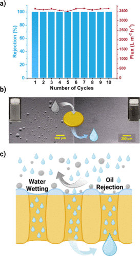 利用TTA-DFP-COF薄膜的超親水蒸氣面,研究團隊測試從礦物油中淨化水的性能,在水通量約為3500 Lm-2h-1的極高通量下,達到99%的除油率,每個循環可有效處理約40 mL的1000 ppm水包油乳液以生產純水。