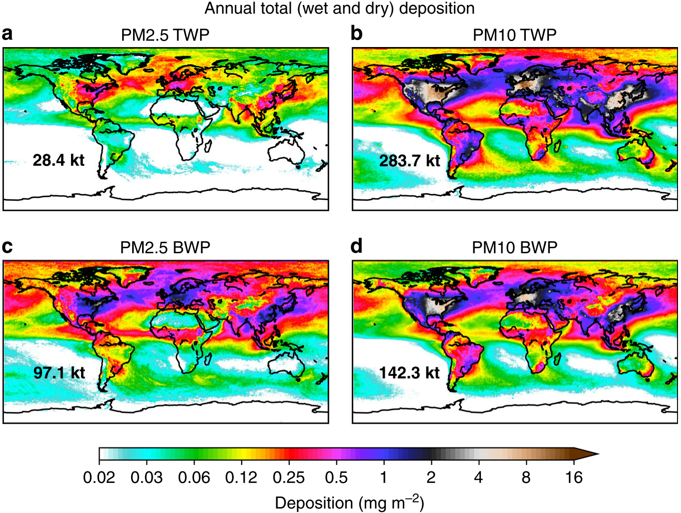 輪胎磨損顆粒(TWP)中,PM2.5在空氣中懸浮時間估計為18-37天,而PM10約5.5-11天。對於煞車磨損顆粒(BWP),PM2.5在空氣中懸浮時間為17-37天,而PM10則為0.94-1.6天。較小的道路塑膠微粒(PM2.5)比較大的道路塑膠微粒(PM10)分散得更廣。PM10道路塑膠微粒主要沉積在熱點排放區域(北美,歐洲和東南亞)附近,約65%沉積在土地上。PM2.5的總沉積量中約有43%沉積在陸地上,約有57%沉積在海中,甚至會沉積在冰雪表面(極地、山脈等)上。