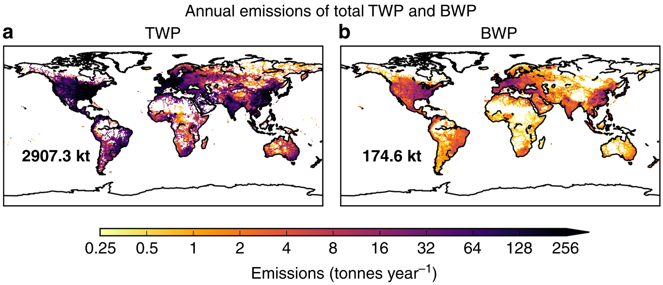 輪胎由彈性體的混合物組成,行駛時在胎面和路面之間的剪切力會產生粗大顆粒或揮發產生次微米顆粒來產生輪胎磨損顆粒(TWP)。磨損程度取決於輪胎的類型、路面和車輛特性以及車輛的運行狀態。大多數汽車煞車系統由於碟煞盤或煞車鼓與來令片摩擦而產生煞車磨損顆粒(BWP)。BWP是金屬和塑料的複雜混合物,其排放量取決於摩擦材料、煞車頻率和程度、速度、重量、車況和環境條件。 近年來,人們廣泛地討論塑膠微粒對微生物、海洋、淡水和陸地污染,而大氣中的塑膠微粒傳輸卻被忽略了。Evangeliou等人的跨國研究團隊,對道路交通產生的塑膠微粒–TWP和BWP在大氣中的輸送進行了全球模擬,探討全球排放的道路塑膠微粒透過大氣輸送與沉積到各洲、海洋,甚至南北極地區的可能性。研究中特別針對平均粒徑為0.5–9.5 µm的顆粒,因為這些顆粒可以長時間在空氣中保持懸浮狀態。 全球道路塑膠微粒的排放量集中在美國東部、北歐、華東、中東和拉丁美洲的大型城市化地區,這些地區的車輛密度最高。全球年度TWP排放總量為2907千噸/年,而BWP為175千噸/年。對於懸浮微粒PM2.5和PM10尺寸範圍,TWP排放分別為29千噸/年和288千噸/年。