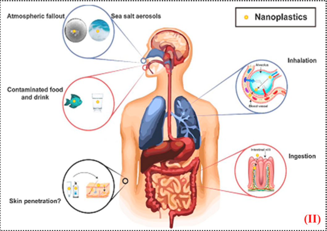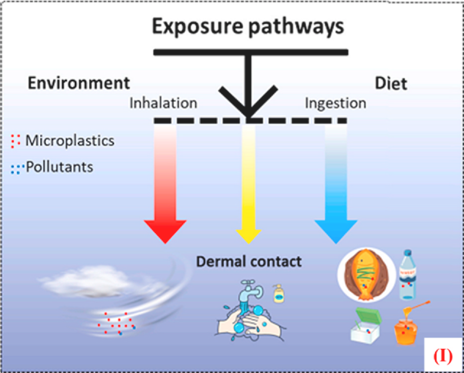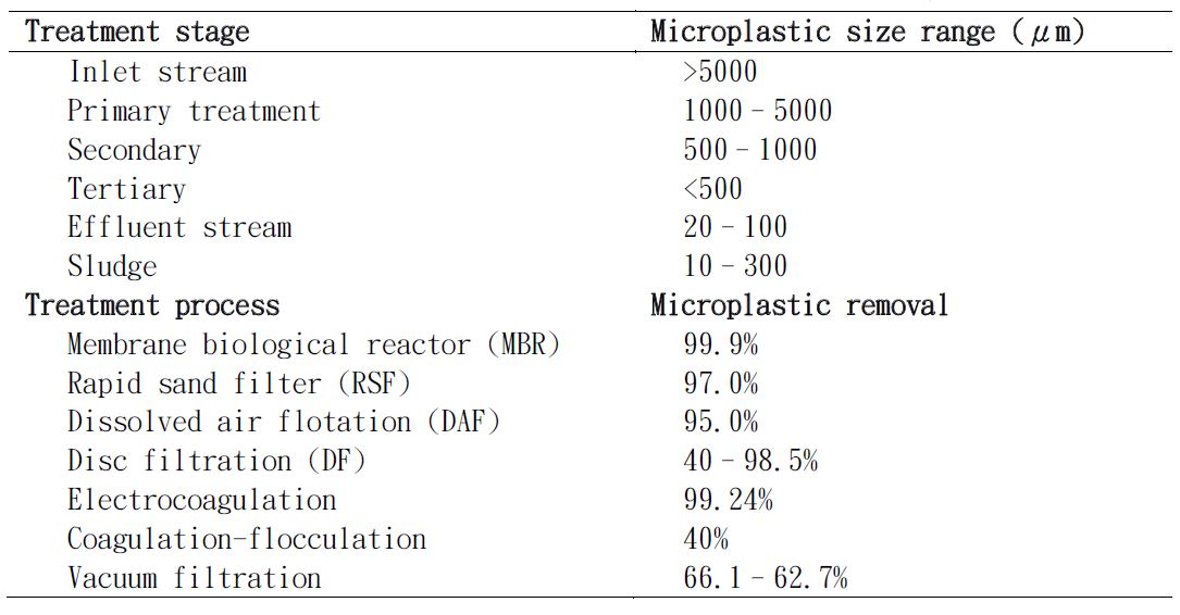 (I)微塑膠的主要暴露途徑;(II)微塑膠的人類暴露途徑 微塑膠可以透過土壤、水及風等三種途徑進入河流和海洋,其中水路被認為是微塑膠散播的主要途徑。根據報導,每年有480至1,270萬噸未經處理的塑膠垃圾從沿海國家進入海洋,對水生環境產生巨大的影響。由於微塑膠無所不在的特性,它們存在於自然水循環和人為水循環中。在人為循環中,在城市污水和污水處理廠的入口和出口中均發現微塑膠的存在。污水處理廠是將自然和人為的水循環連接起來的通道,因此在微塑膠碎片被釋放到水生環境之前,它成為防止微塑膠碎片散播的最終屏障。 傳統的污水處理廠常包含一級(沉澱)、二級(生化池)及三級(砂濾)等三個階段。雖然污水處理廠並不是為去除微塑膠而設計的,但由於過濾過程中發生的各種機制,微塑膠顆粒可能會被攔截。例如,透過多孔材質過濾所引起粗濾、沉降、撞擊、攔截和擴散等機制。平均而言,在一級和二級處理階段可去除88%左右的微塑膠,而在綜合一級、二級和三級處理階段可達到94%以上的去除率。
