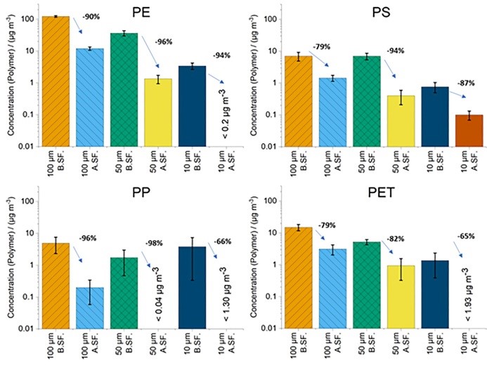 微塑膠採樣系統 下圖顯示顆粒的質量濃度隨著過濾器部分尺寸的減小而降低,即在100 µm砂濾器上的顆粒質量濃度比與50 µm和10 µm過濾器上的高,隨著顆粒尺寸的減小,顆粒的總質量也會降低。砂濾器前後的濃度,可以觀察到所有聚合物濃度的大幅降低。PE的平均去除率為94% ± 3%,PS為87% ± 6%,PP為87% ± 15%,PET為75% ± 8%。