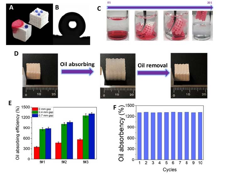 下圖顯示3D列印有機矽墨水的油/水分離膜及多次循環後保持性能的能力。分離油和水的能力取決於材料的性質,利用3D列印產生孔隙率。在光聚合反應中,使用紫外線(UV)或可見光引發樹脂交聯以形成3D結構,達到精細控制物體表面。