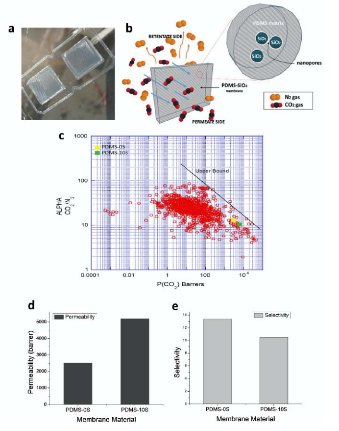 3D列印矽膠膜的二氧化碳分離性能:(a)直寫成型(DIW)列印的PDMS膜。(b)通過PDMS膜進行氣體分離的機制。(c) Robeson 上限相關圖顯示PDMS-0S和PDMS-10S膜與文獻中報導的其他膜相比的氣體分離性能。PDMS-0S和PDMS-10S的(d)滲透性和(e)選擇性。