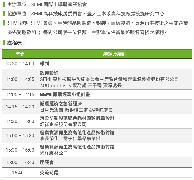 SEMI 將於5月31日舉辦「循環經濟與資源再生研討會」,針對資源再生、污染防制設施、綠色耗材、源頭減量設計及製程汙染物處理轉製等資源循環技術做探討及分享,邀請晶圓製造、封裝以及面板製造相關業者參與,分享產業鏈不同階段落實循環經濟的策略與成果。